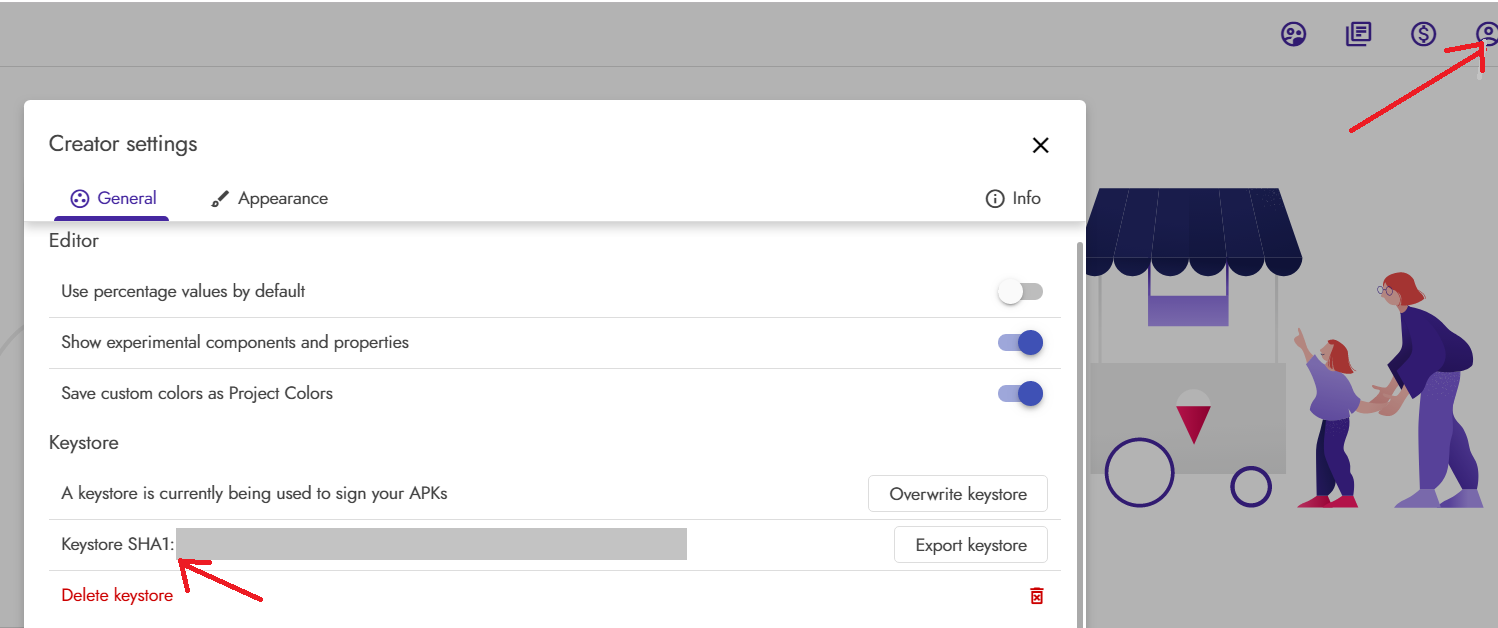 If it says there is no keystore, you can either upload a previously downloaded keystore file, or you can export any project as an APK to generate a new keystore