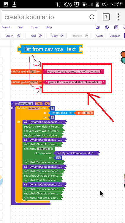 Use list from csv row text between initialize global variables and text, because otherwise global variables are not lists