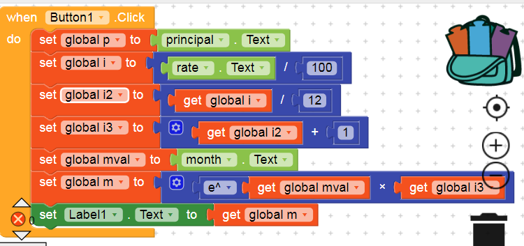 i want to make an loan emi calculator in my app but unable to make loan emi calculator stuck in base and exponent pls help me to provide the block code of emi calculator