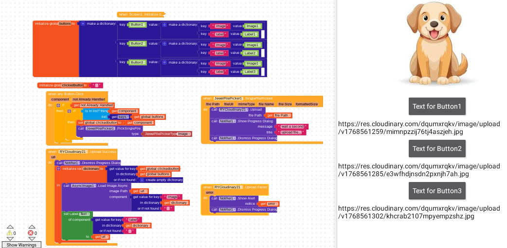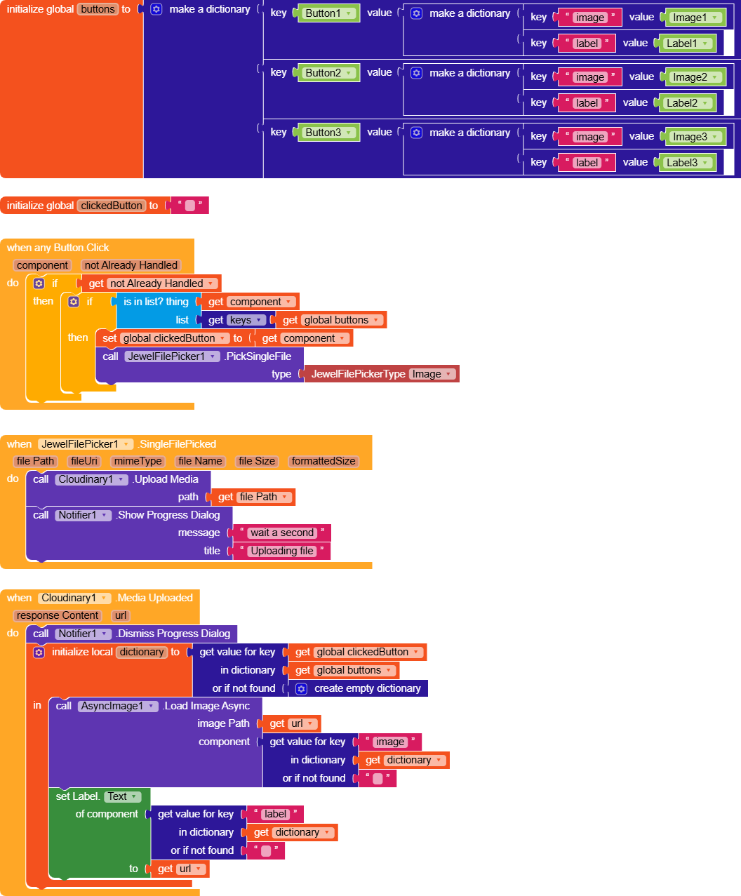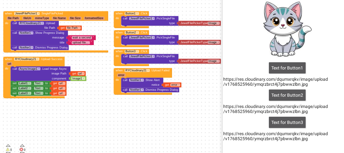 Then, when the response from Cloudinary is received, the dictionary is queried using clickedButton as the key , and the two components, label and image, are returned, to which the URL value is assigned.