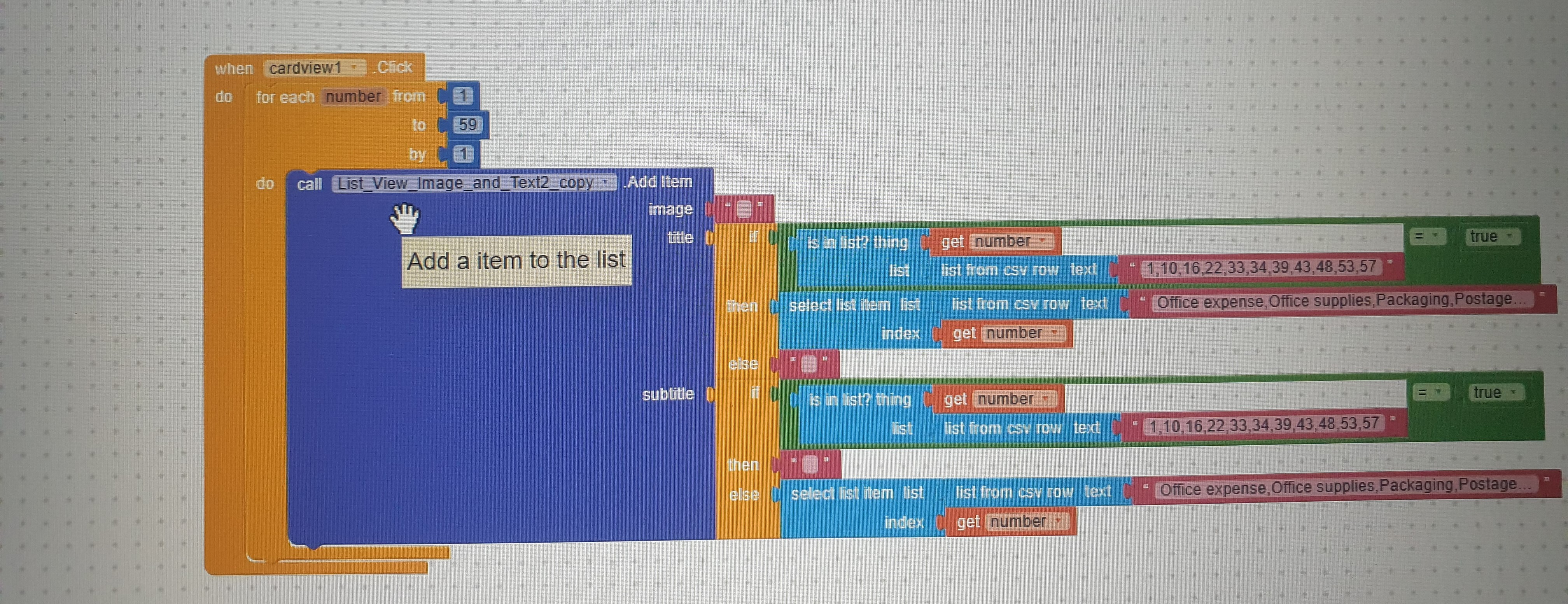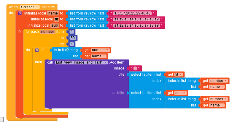 Then (use the list view add item), title - select lust item list (list from CSV row text) index (get number)