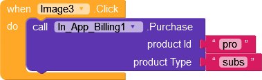 Errors occur when using the Purchase block due to an incorrect number of arguments. Error - call to ‘com.google.appinventor.components.runtime.Billing.Purchase(java.lang.String)’ has too many arguments (3; must be 2)