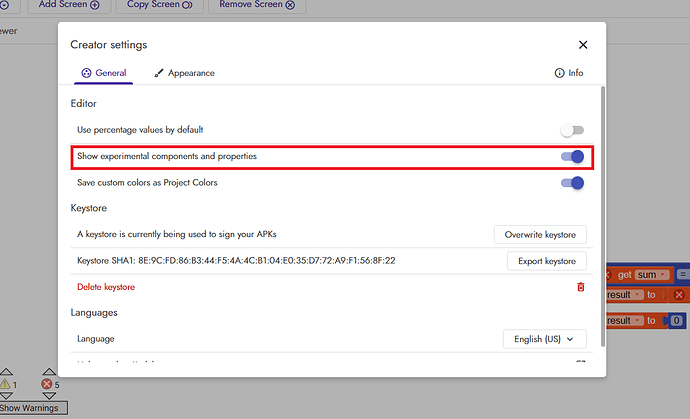 I’m sorry I can’t find the experimental section in the designer view in the Screen1