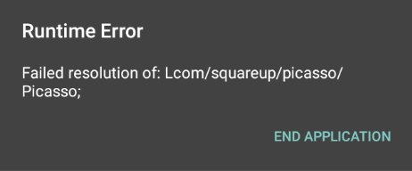 05-23 16:40:03.883 22504 22504 W System.err: Caused by: java.lang.ClassNotFoundE xception: Didn't find class "com.squareup.picasso.Picasso" on path: DexPathList[ [zip file "/system/framework/org.apache.http.legacy.boot.jar", zip file "/data/a pp/com.ficalapps.test-_HV7gC95X4x3bpUCKG1tLg==/base.apk"],nativeLibraryDirectori es=[/data/app/com.ficalapps.test-_HV7gC95X4x3bpUCKG1tLg==/lib/arm64, /system/lib 64]]