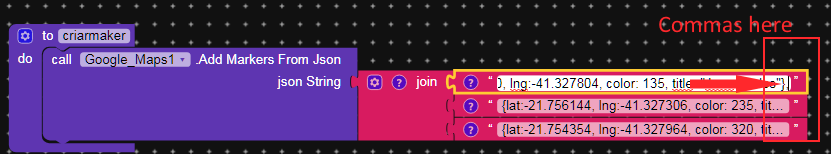 And this is an example of a string that I must create to pass as a parameter to the Add Makers method (already tested): [{lat: -21.755590, lng: -41.327804, color: 135, title: “Joao Carlos”}]