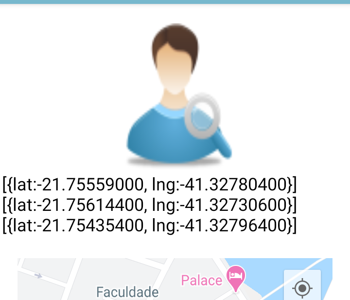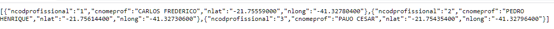 Response Content = [{“ncodprofissional”:“1”,“cnomeprof”:“CARLOS FREDERICO”,“nlat”:“-21.75559000”,“nlong”:“-41.32780400”},{“ncodprofissional”:“2”,“cnomeprof”:“PEDRO HENRIQUE”,“nlat”:“-21.75614400”,“nlong”:“-41.32730600”},{“ncodprofissional”:“3”,“cnomeprof”:“PAULO CESAR”,“nlat”:“-21.75435400”,“nlong”:“-41.32796400”}] Algorithm