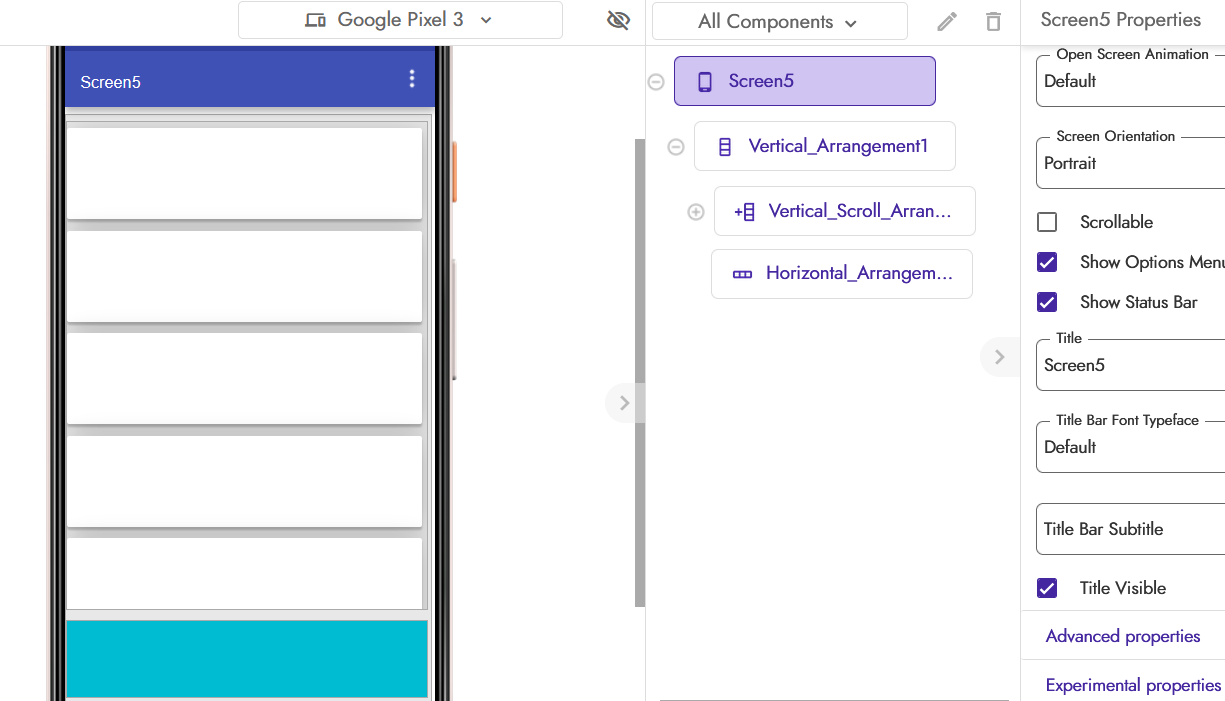 Do not set Screen to scrollable. Create a VA and inside that put a scrollable VA and a HA that will be your submenu.