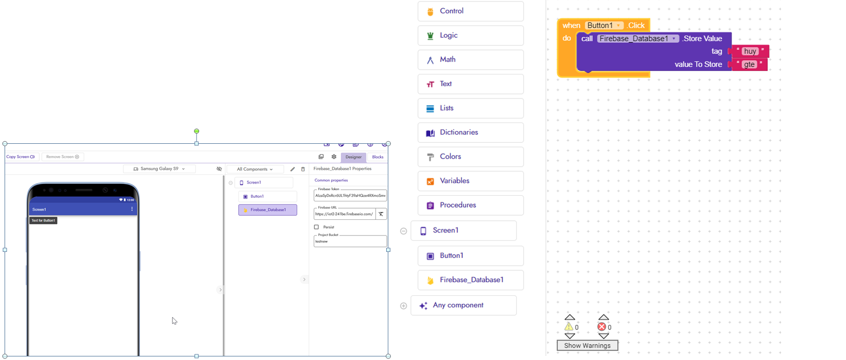 Firebase stores data, no problem. If you want to see it in your app you should use get value block and when firebase got value block