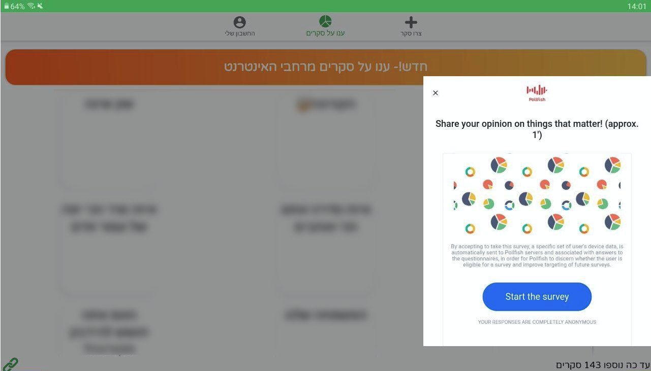 Pollfish: Yes. However, you should follow Google Play Store Terms of Service (ToS) for placement of buttons that triggers the survey