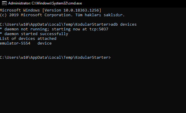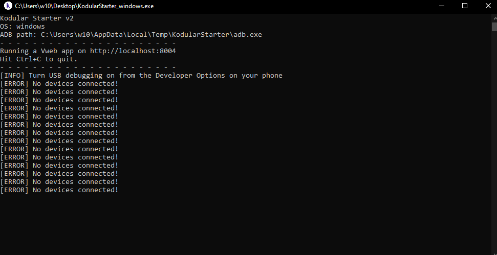 The Kodular Starter is used to test via USB, and looks like a command prompt