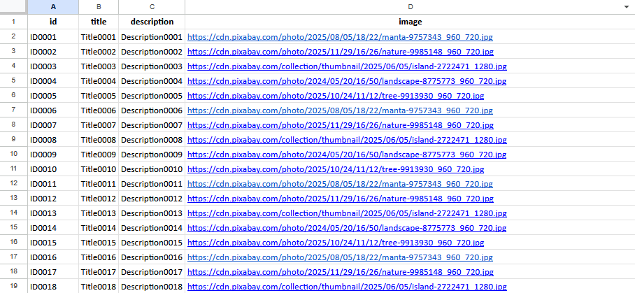 Here we will use the Google Sheets export function to obtain the range, below is an example for A1:D50