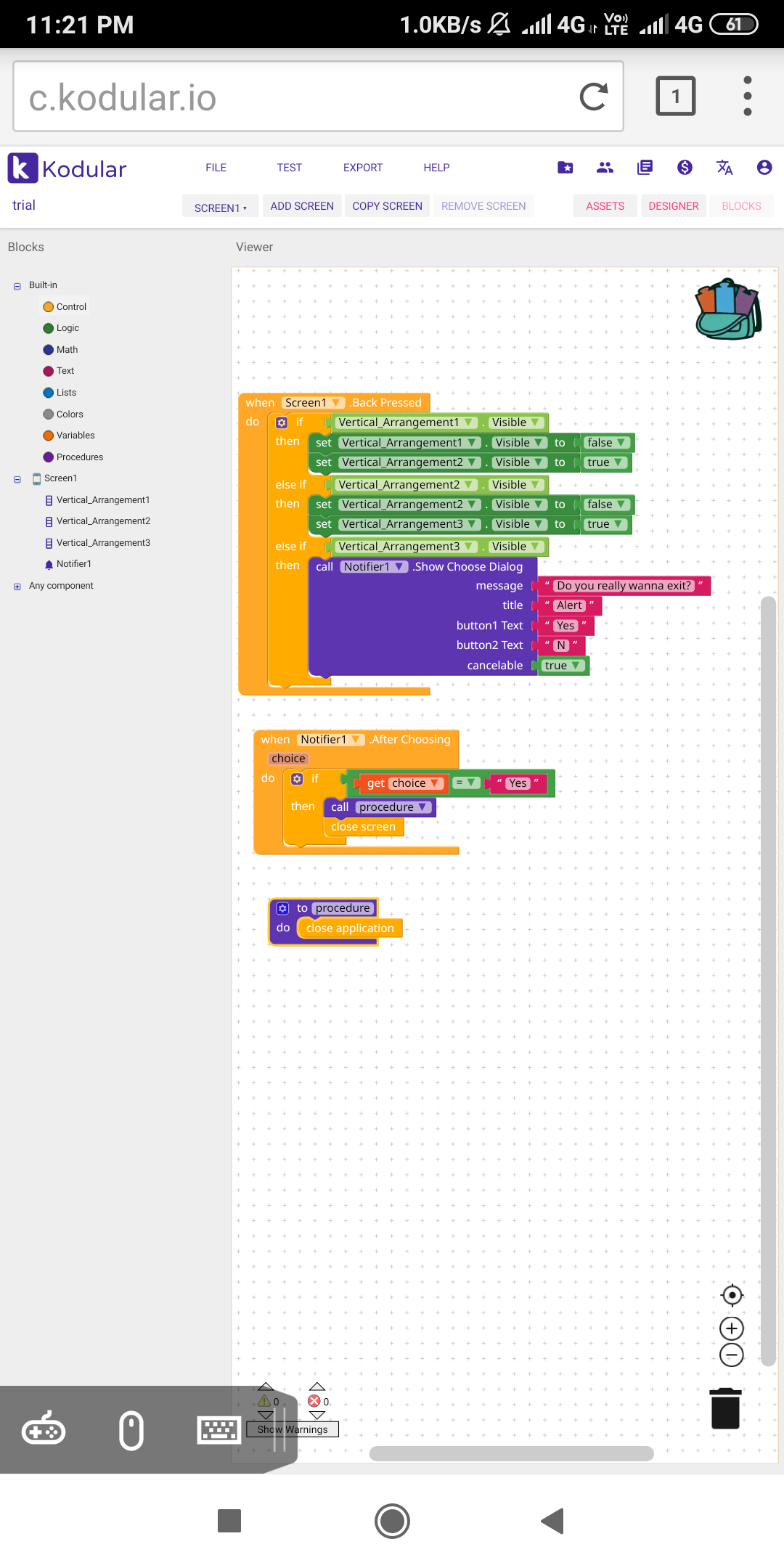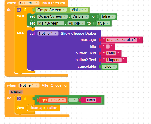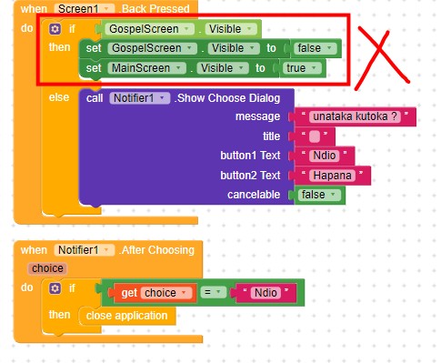 hello, in my block, i want the user to select yes or no when they want to close application, however when i try to close an app, it open again, any advice please on how do i arrange my block