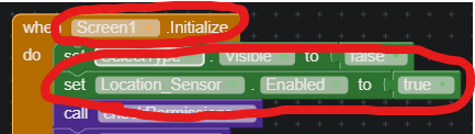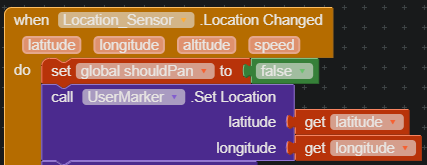 Those are the blocks I use to visualize the user (the sensor is hooked up to a map component but also not working there except one time after installing the app, after that it fails to get the user location even after multiple minutes. The map does not move to my location).