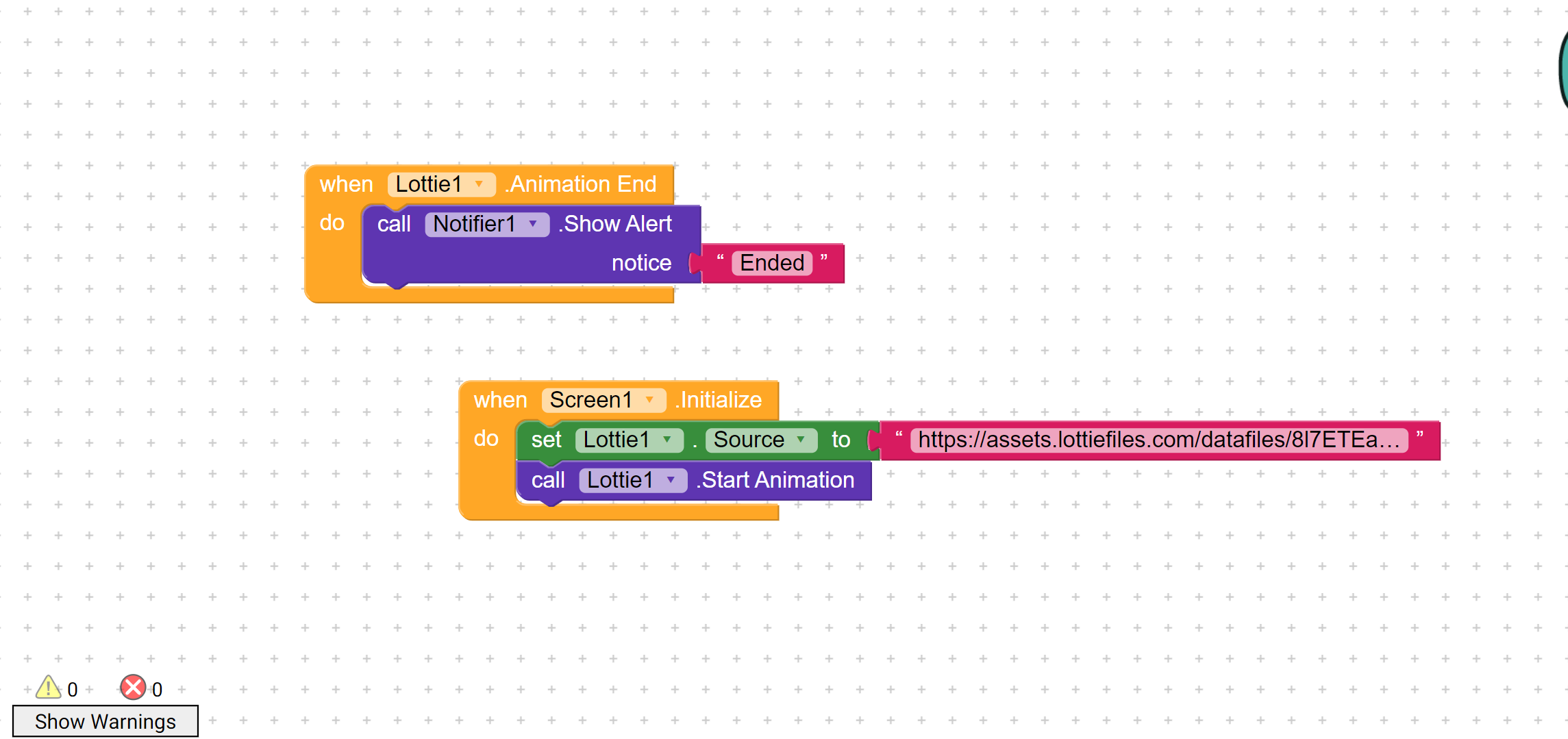 What I basically want to do is to hide the animation as soon as it ends. Setting width and height to 0, setting it’s visibility to false, nothing is executed in the ‘when lottie1 animation end’.