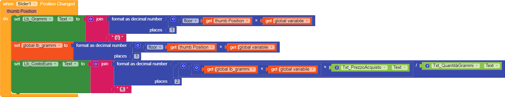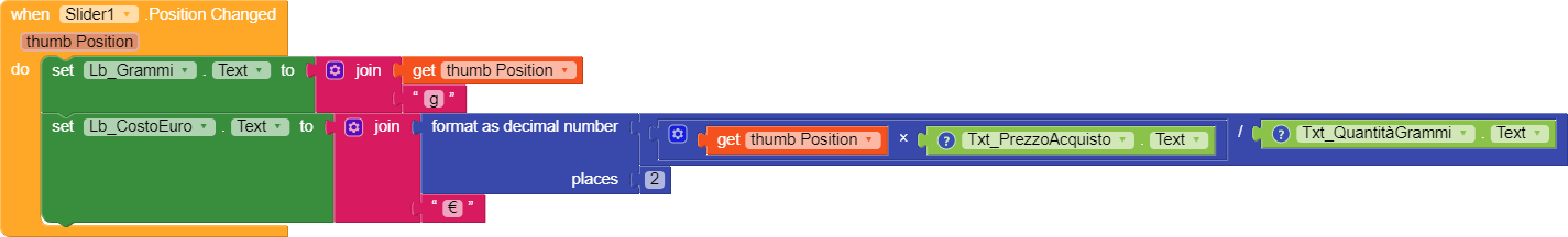 I want the slider to show on a left label the quantity of food used (in grams) and on the right label the money it costs that is variable on the quantity.