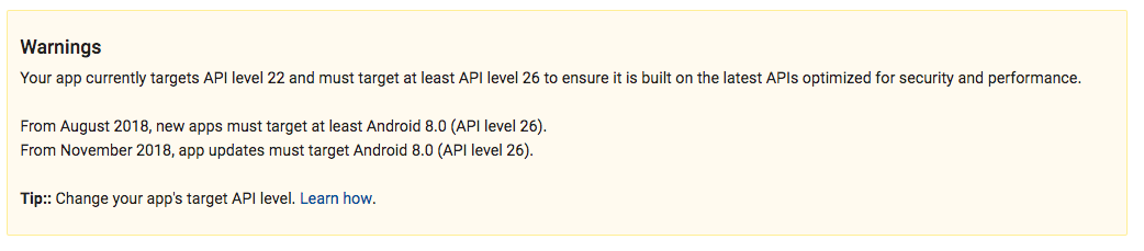 Upgraded Target SDK to API 27 (Android 8.1)- This warning will NOT appear again: