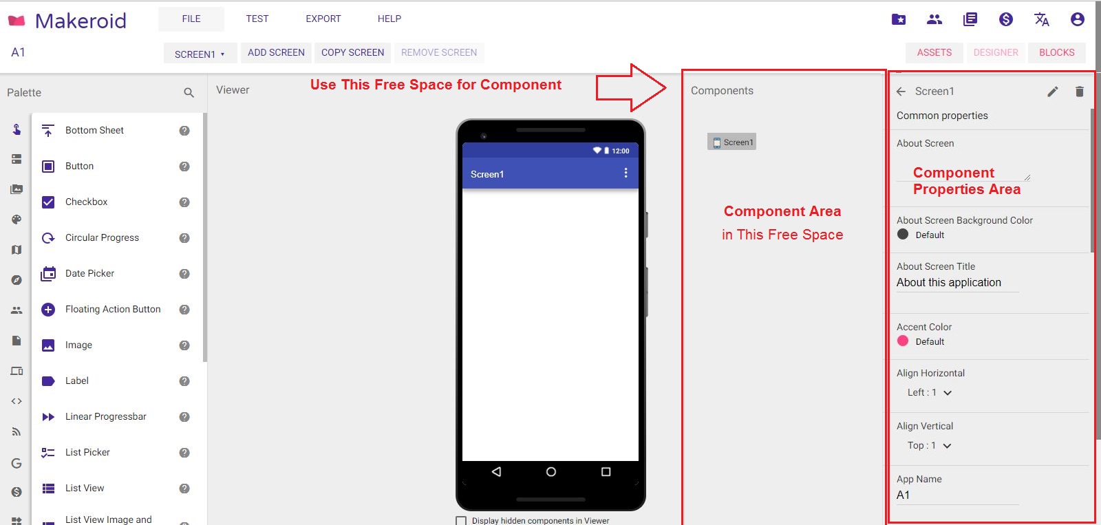 Makeroid पर कार्य करने में कई कठिनाइयां हैं एक Component से दूसरे Component तक बार बार जाने में काफी समय लग रहा है। इसलिए, आप अनुरोध करते हैं कि Makeroid की Free Space का उपयोग किया जाए जिससे Makeroid पर कार्य करने के समय को कम किया जा सके। साथ ही मेरे द्वारा एक उदाहरण भी दिया गया हे जिससे आपको component और Component Property दोनों के लिए अलग अलग जगह का इस्तमाल करे।