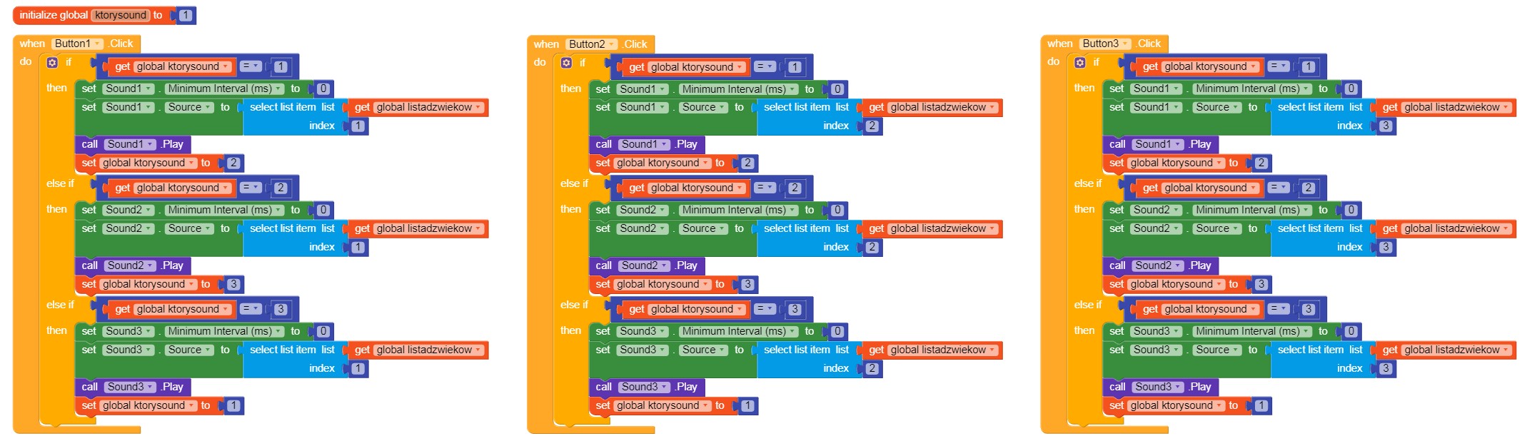Blocks below, maybe someone will use it in the future - tested on 6 buttons with sounds in total and it works (3 sound components used = max 3 sounds can be played at the same time).