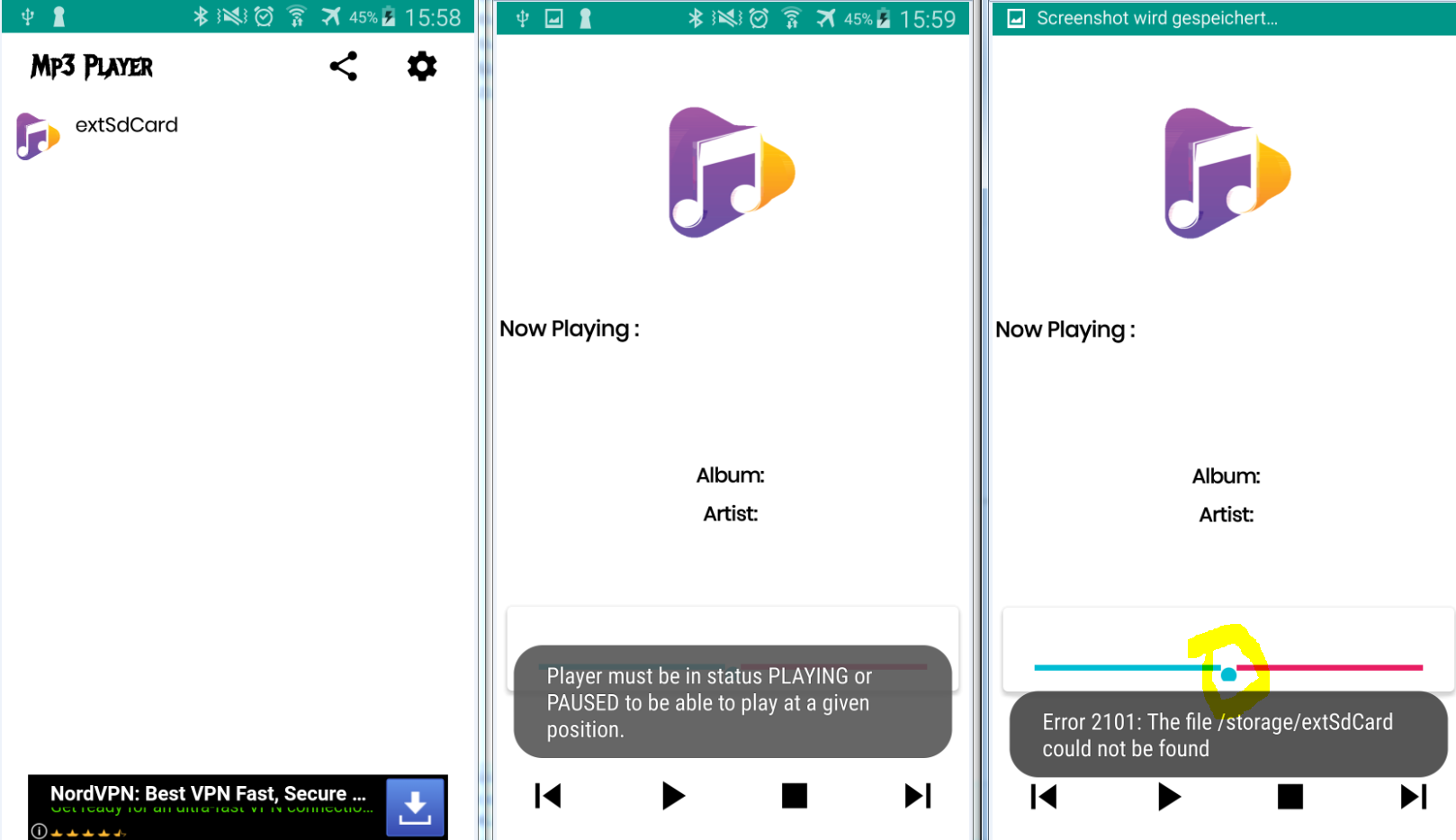 On another test device (Android 5) extSdCard is displayed after about 5 seconds, after clicking it I get several error messages: "... must be in statusPlaying or..." and "Error701: Unable ..."