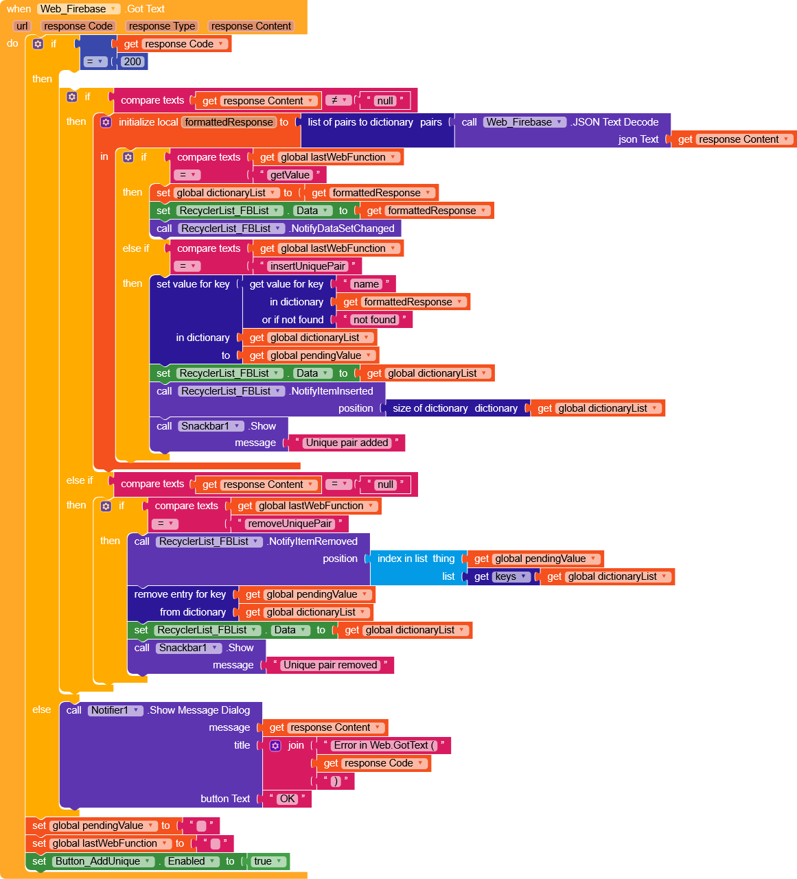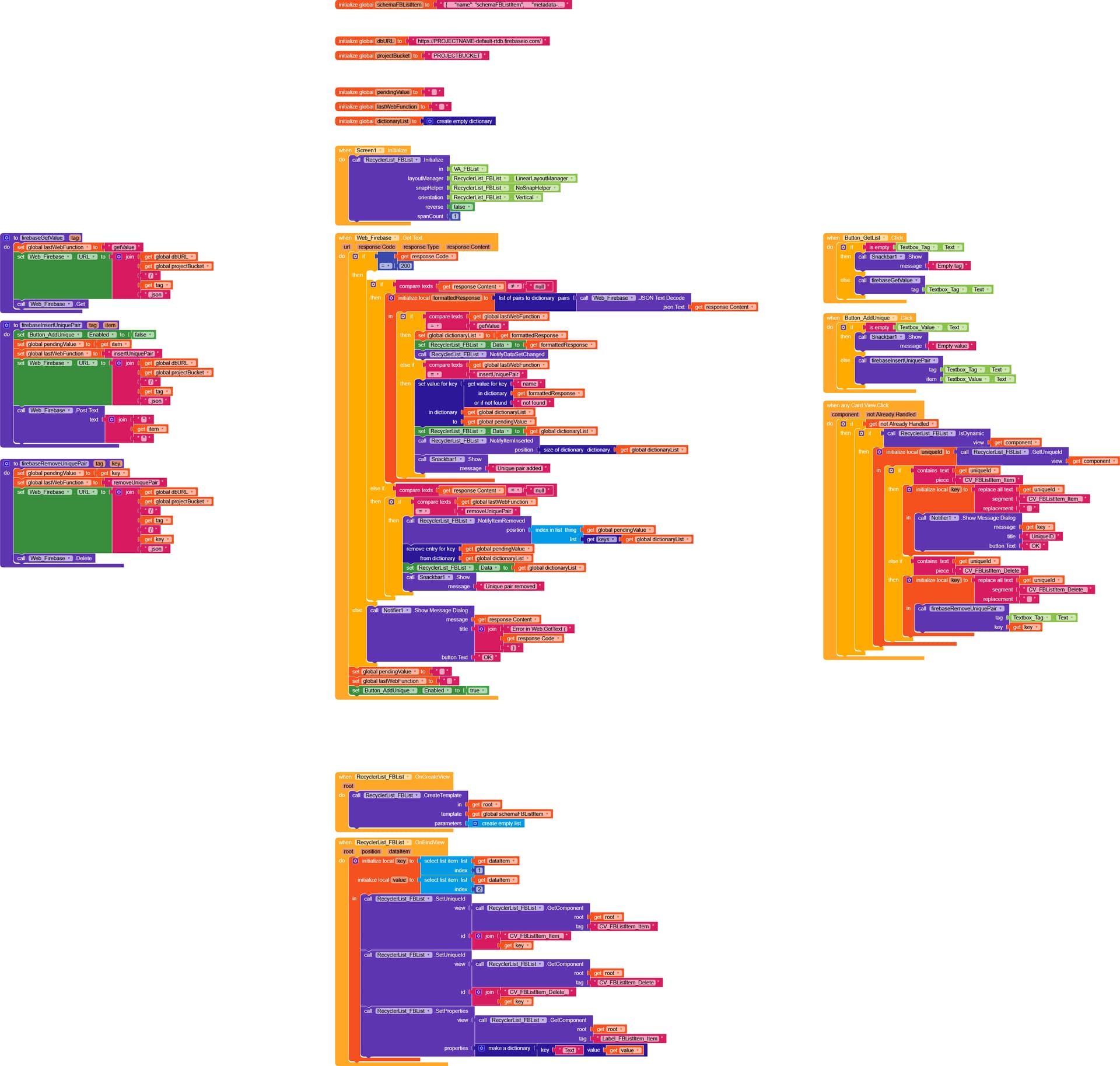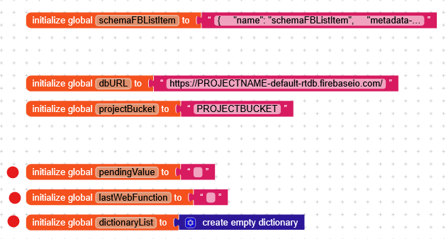 schemaFBListItem: contains the JSON template of the item for the RecyclerListdbURL: the URL of the Firebase databaseprojectBucket: the Firebase project bucketpendingValue: simply a variable used to store the value pending deletion/insertionlastWebFunction: used to keep track of which Web function we’re executing (deletion/insertion)dictionaryList: the dictionary containing our “list” of items