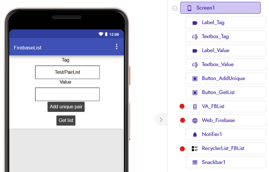 VerticalArrangementto contain the RecyclerView listWebcomponent to communicate with FirebaseRecyclerList