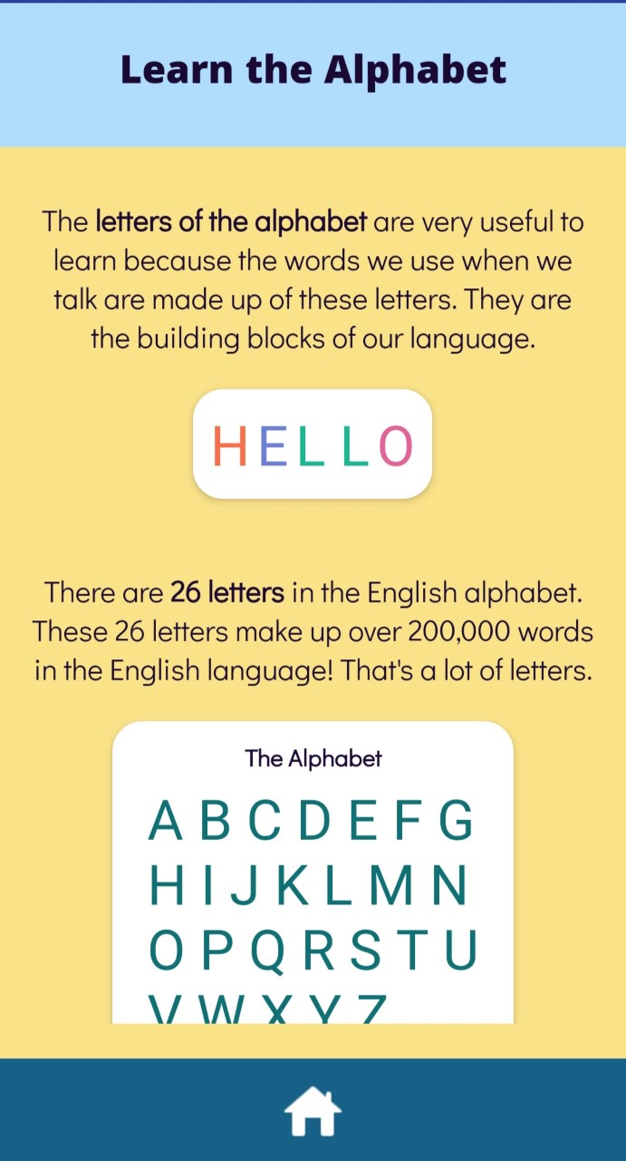 Its a very basic app with some information on the alphabet and a little game that can help kids properly memorize their ABC’s.