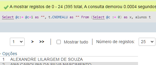 Select @c:= @c+1 as “”, t.CNOMEALU as “” From (Select @c := 0) as x, alunos t