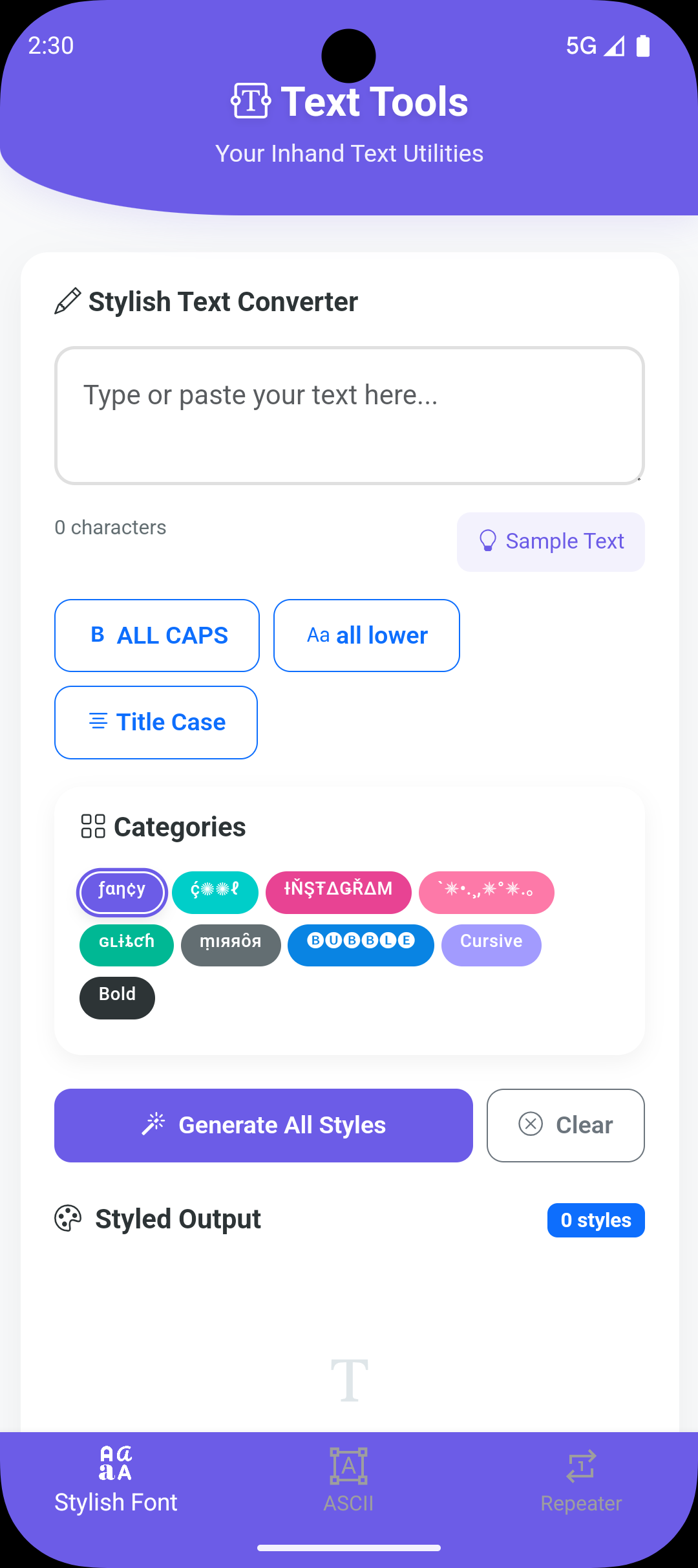 - Font Converter : Generate 30+ stylish text styles (fancy, bold, cursive, glitch, etc.)