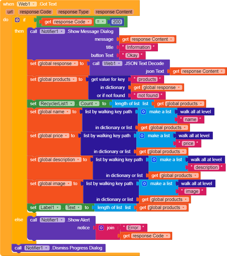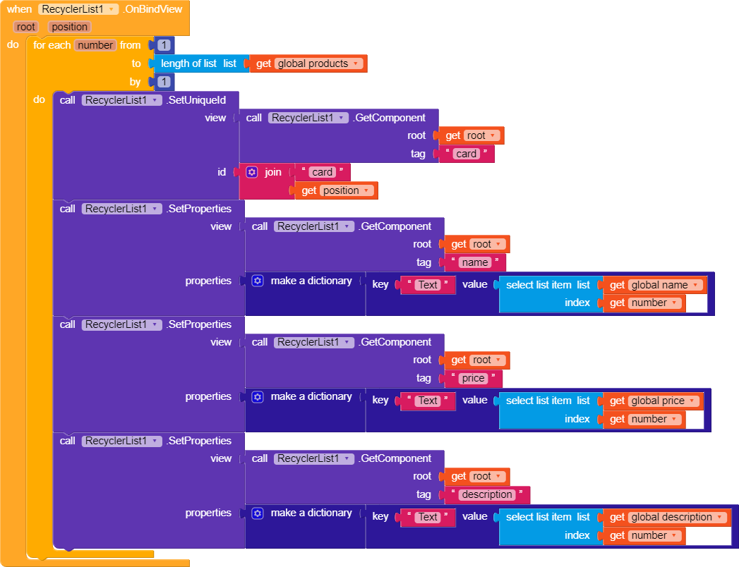 Hello to all. I would like to ask some help regarding RecyclerList and Data from mySQL. I have 3 records in my database with columns, product_id, name, price, description, image. i was able to successfully get all the data but im having trouble with binding(im not sure of the term) them in recyclerlist. It can show 3 card view, but It will only show the 3rd record for the 3 of them. I have tried it with 2 records, and only the 2nd record will show on the 2 cardview. It should be, 1st cardview is for the 1st record, 2nd cardview is for the 2nd record, and so on. Here is my blocks and i hope you can spare some of your precious time. thank you.