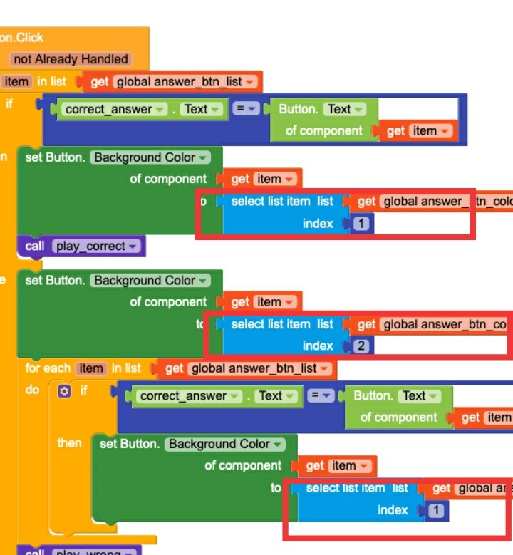 You need to replace the item with select list item list (get global button) index (index is in the list thing (component ) list (get global answer button)