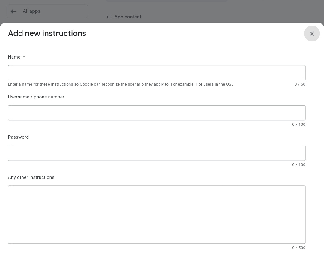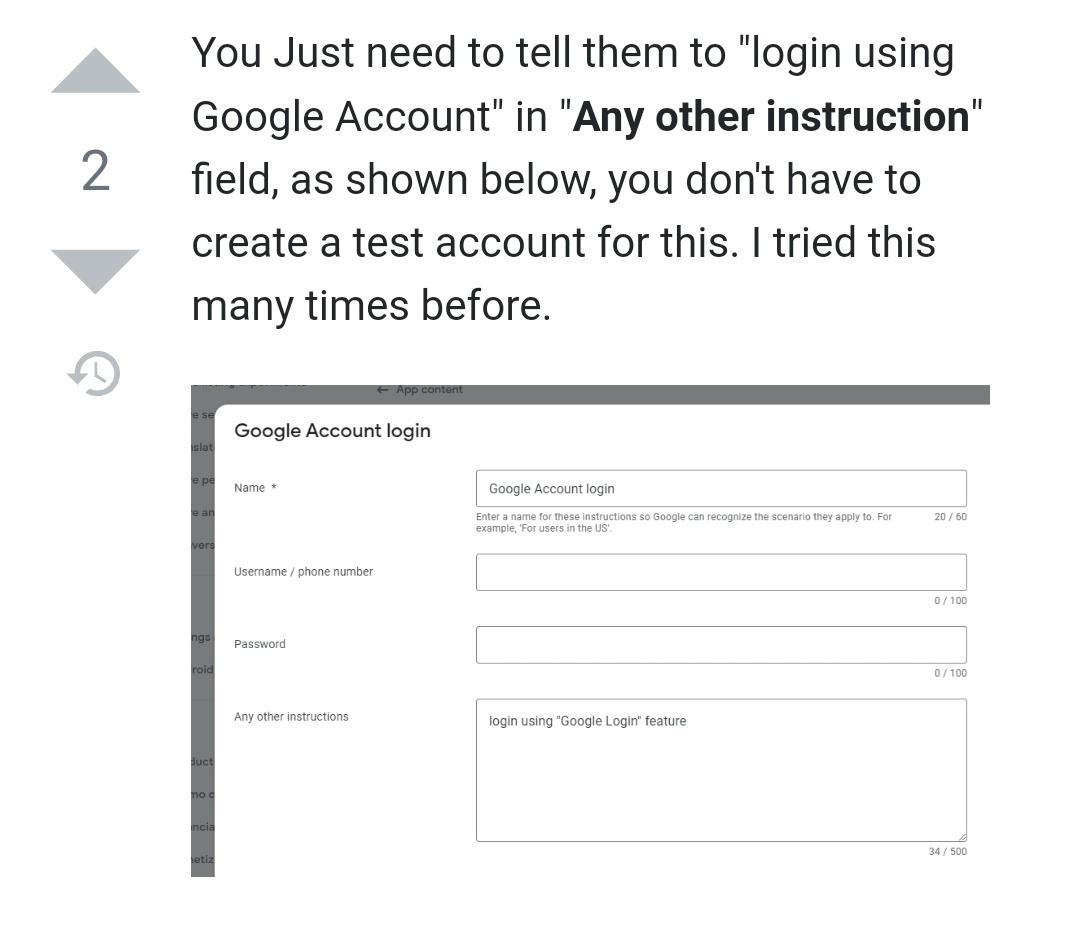 If you have registration system in your app then you’ll need to give Google an test account inoder to test your app. Just put anything like test account on the name then put the login credentials for your app.