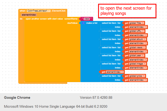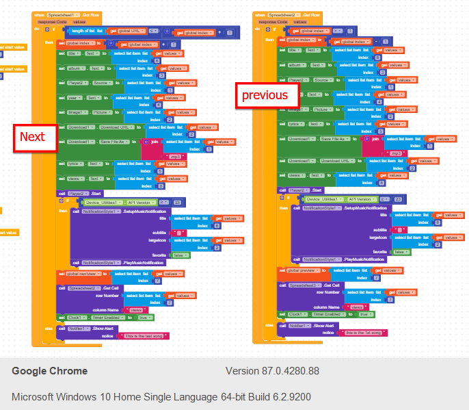 I have created a music app which calls data from airtable. When the user clicks on the music it opens another screen and the music starts playing. The next and previous button works fine untill the 100th song. After that the next button does not work. I tried making two lists so that the the 147 songs gets divided and there won’t be a problem, but this is not making my app look good, i want all the songs at one place. So, can anyone please help me, probably the blocks are wrong.