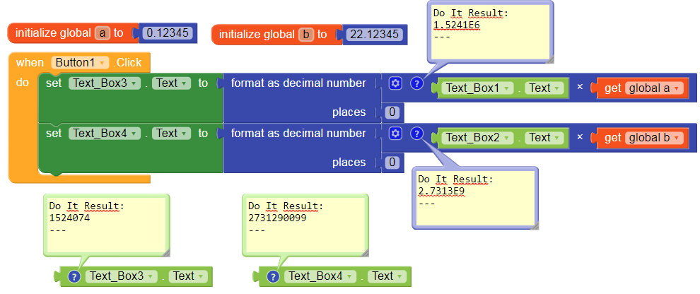 I have tried to multiply T1 with global “a” when button1 click & display it in V1.