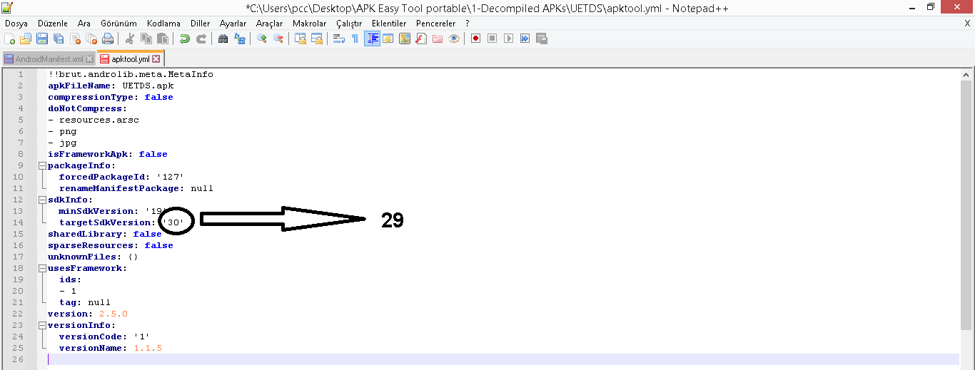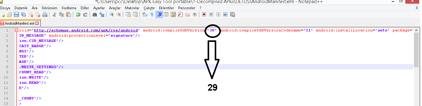 You could use APK Editor Studio, decompile apk, edit androidmanifest.xml and decompile apk. After that you have to convert/modify apk into aab file in order to target api 30 again using procedure posted below, if you wish to upload app to Play Store. Haven’t tested it to see if onesignal works after the convertion to api 30