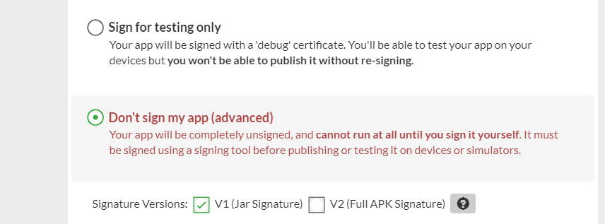 - If you want to upload new apk to google play store you need to sign your apk with V1 jar and Full Apk options.