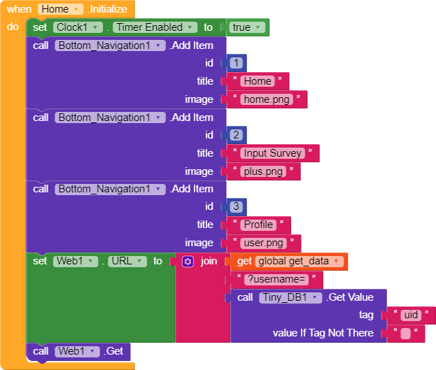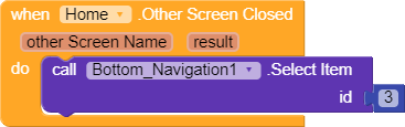 On Home screen use other screen closed block and use if then condition to compare the result value and set block select bottom navigation to 3.