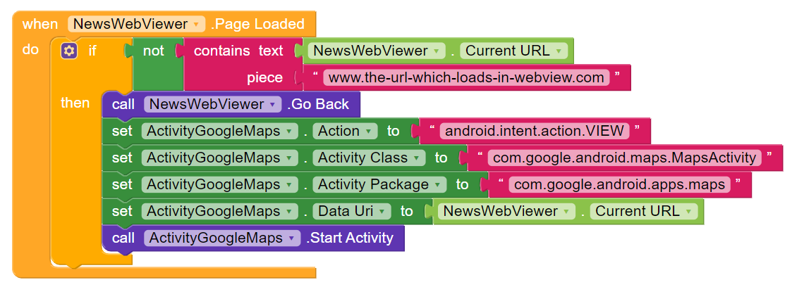 I am using Webview in my app and I have a location link in it. I want to open google maps app when i clicked that link with location parameters. Isaw an tried a few samples but I couldn’t find exact solution.