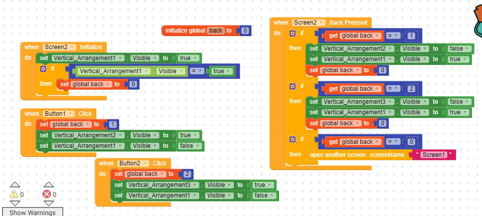 I have 3 vertical arrangemets in screen2 and two buttons on vertiacl arrangement1 they open other two arrangemts respectively upon clicking.i want my that when it is back pressed then it should open vertical arrangement 1 and when arrangemnt 1 is open now upon press back button it opens screen 1.