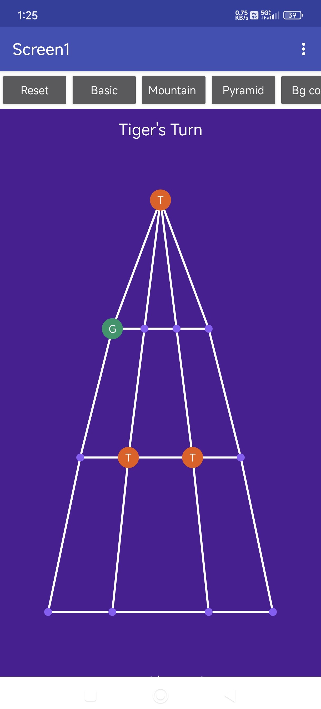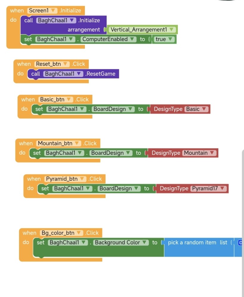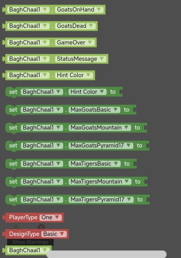 An extension for MIT App Inventor 2.BaghChal is a disproportionate strategy game, which means that the Goats and Tigers on the board do not have the same powers during the game. The Tigers have the ability to capture goats and eliminate them from the board whereas the Goats have the power of superior numbers for trap tigers. **Burst Animations** on eliminate with hint color on valid moves. Developed by TechHamara using Fast.