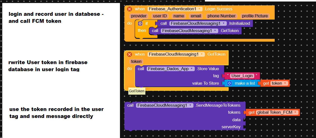 Hello friend, I use these blocks with firebase Authenticator. When the user logs in, I subscript the name (with an underline instead of a space). Then just send a message to that user using the saved login.