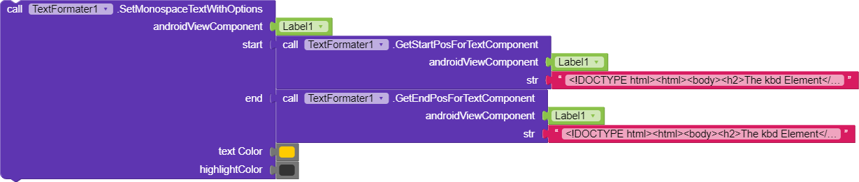 This block allows you to set text as monospace in a TextView or TextBox while customizing various options within a specified text range. You can set the monospace font, text color, and highlight color for the specified range.Results: