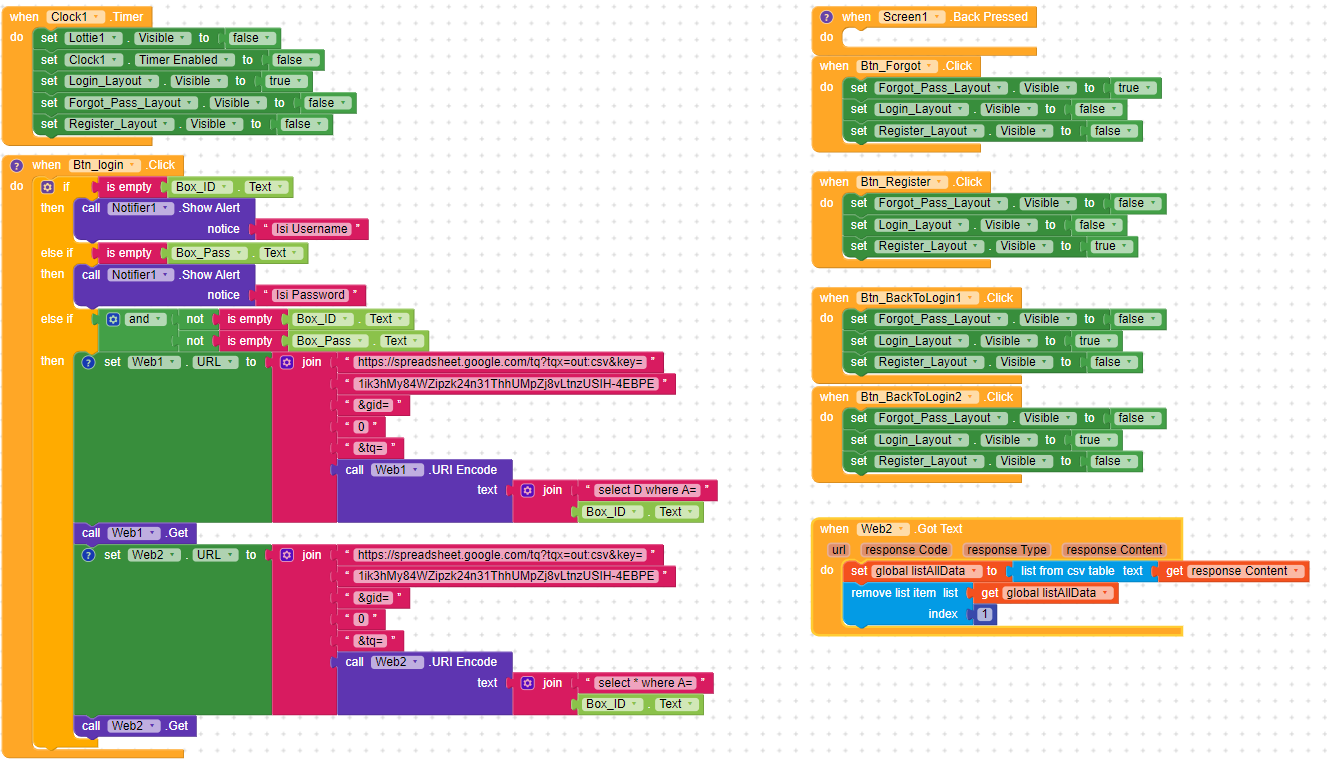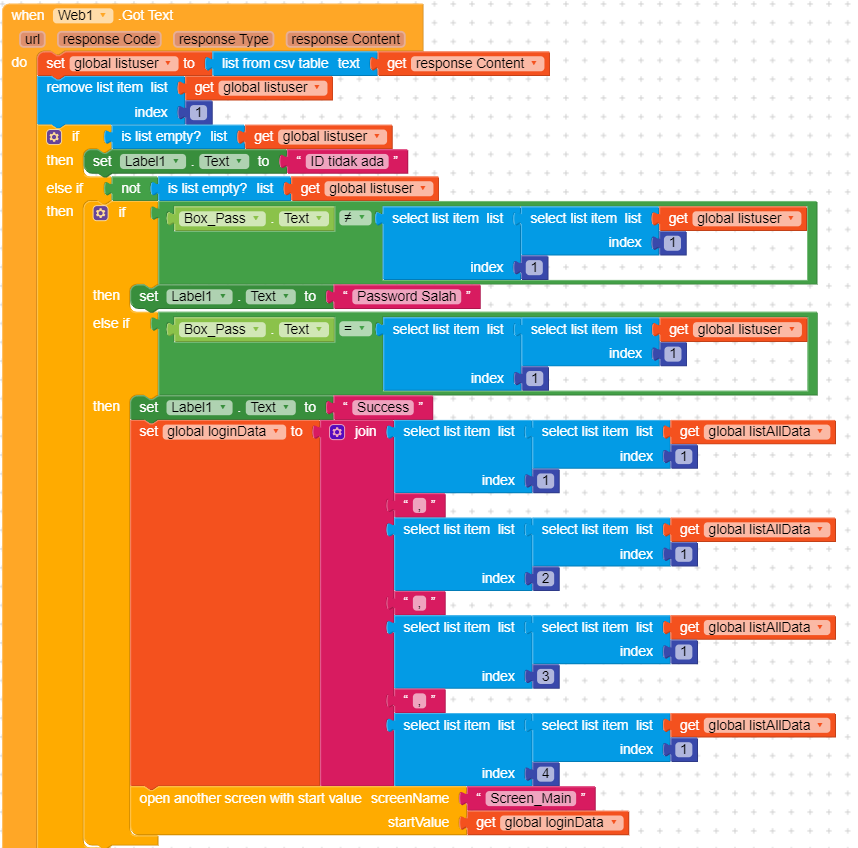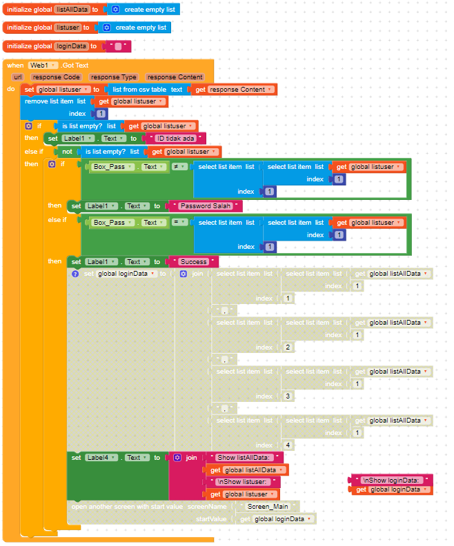 I’m trying to develop login app using spreadsheet as the login information. I managed to handle the login form process and successfully to do the screen changing (second screen called Screen_main).
