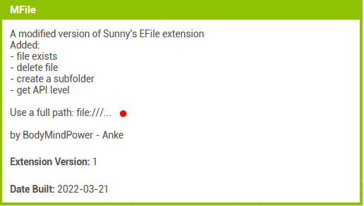 UPDATE (Feb 28, 2022): To get rid of the annoying problem / bug "Error 908: The permission WRITE_EXTERNAL_STORAGE has been denied. Please ..." you MUST set DefaultFileScope = Legacy (Designer). Here is versions of an extension, with which both...