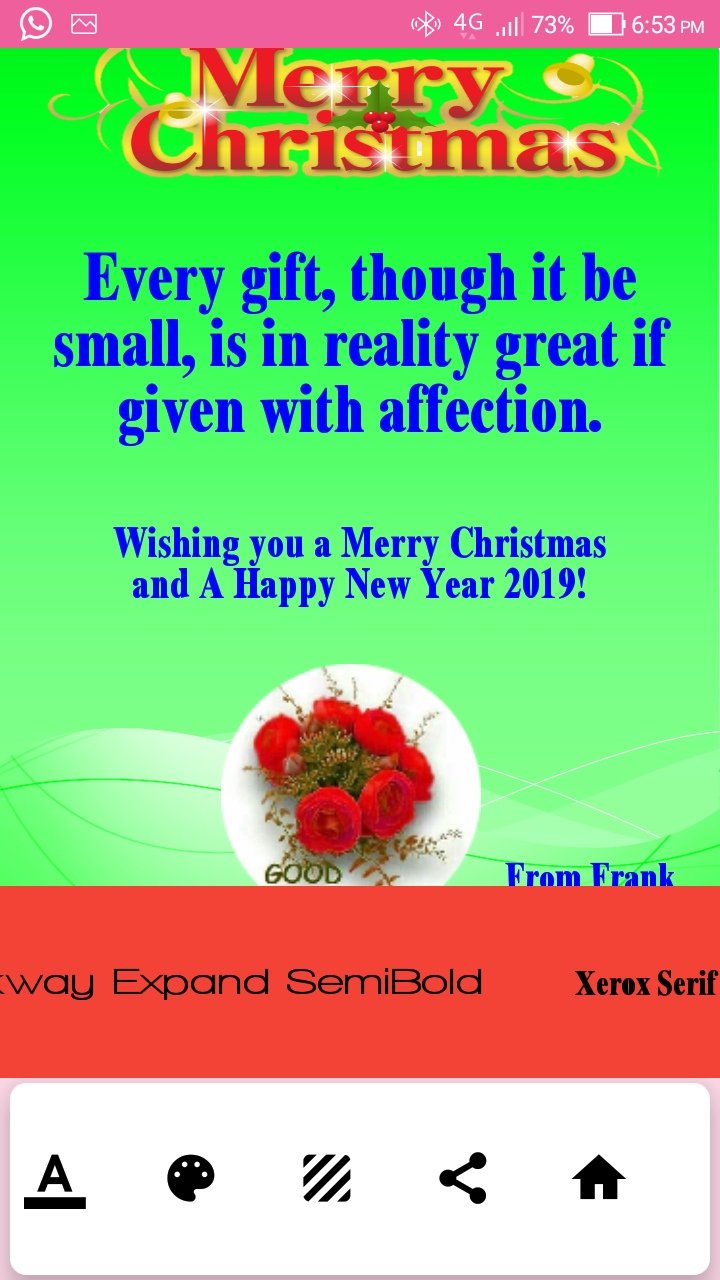 This free Christmas greeting cards app helps you send the most appropriate and thoughtful eCards to your friends via WhatsApp, Facebook, Twitter, Mail or MMS or any social network installed in your device.