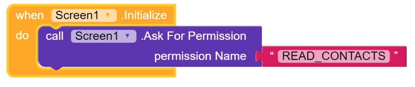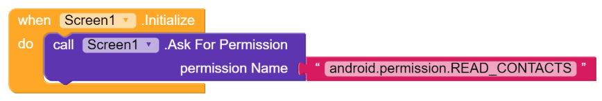 Now since I use my app to send SMS, I also need the SEND_SMS permission. My app asks for it automatically the first time I open my app although I did not explicitly ask for this permission. Why does it ask for the SEND_SMS permission but not the READ_CONTACTS permission when I even asked for it explicitly in my blocks? Is it a problem of the app asking for two permissions during screen initialization? Is this not supposed to be done? If so, how do I properly ask for the READ_CONTACTS permission so that I get it the first time I open my app?