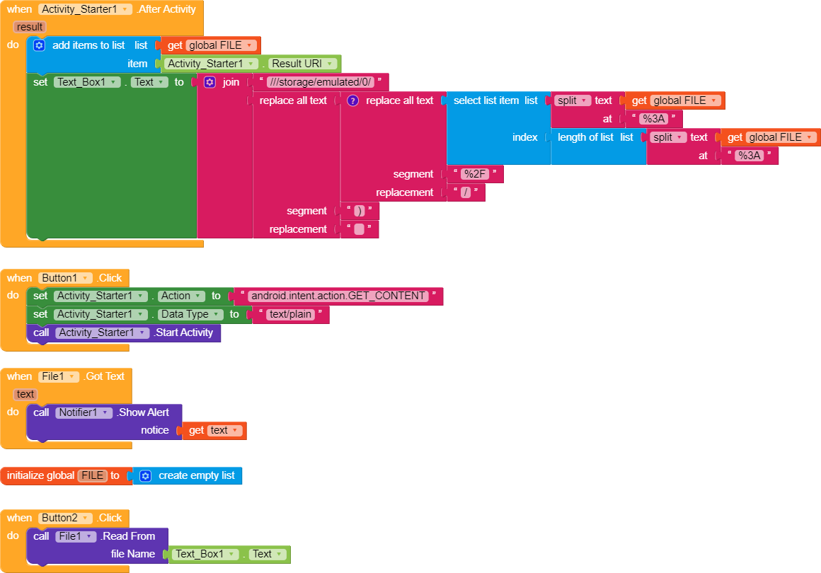 Greetings to all, I want to add the contents of a text file to a text box. However, the File block presents error 2101 the file cannot be found. Thanks. Here are my blocks …