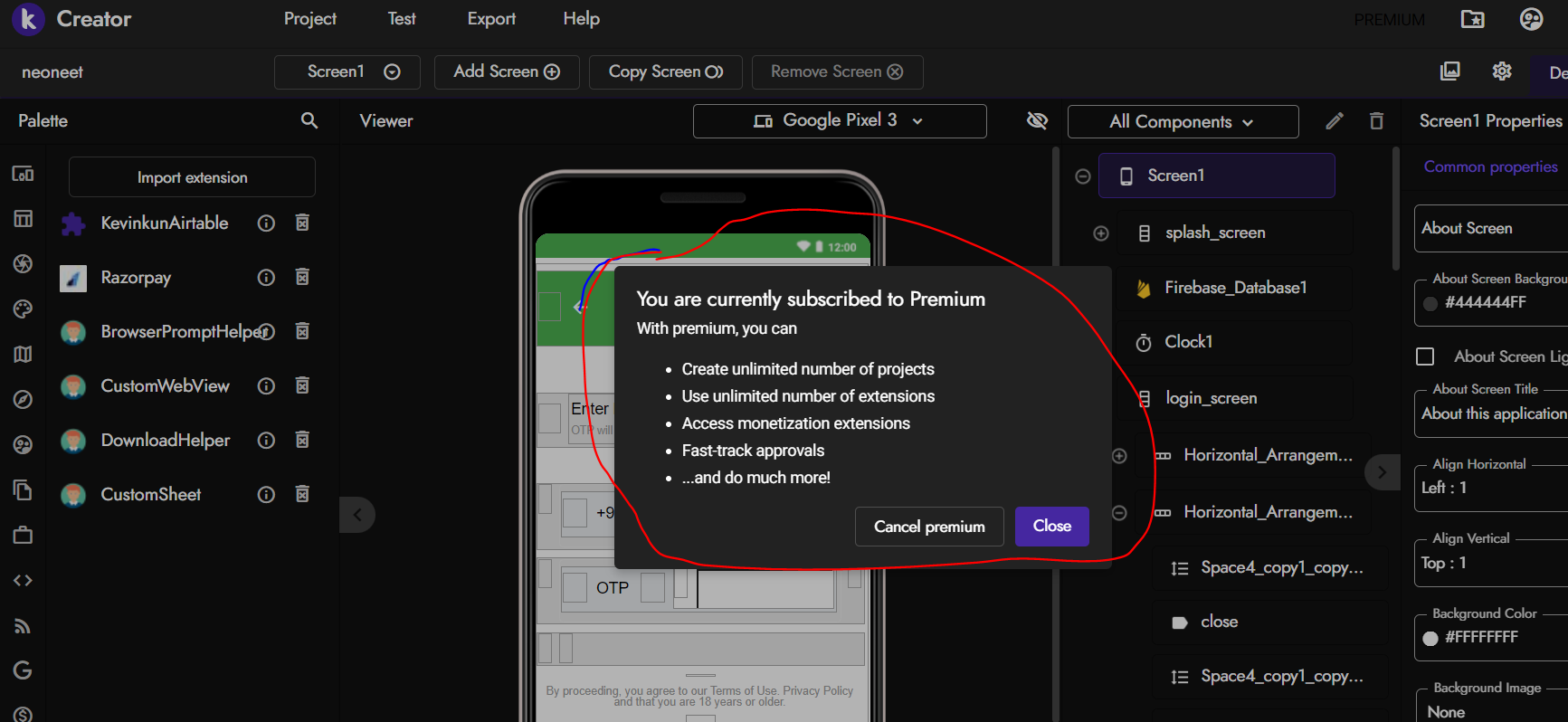 I have subscribed to premium but when I build .apk (tried re-import and a lot of refreshing) but it always shows me the same thing as shown in below.
