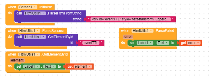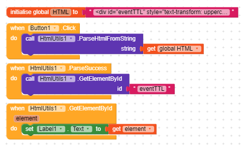 First of all, I tried in the companion using the block “ParseHtmlFromSting” in the initialization and I didn’t get anything (the label remained with the default text “Text for label 1”). Then I always tried in the Companion by putting the block “ParseHtmlFromString” after pressing the button (as you did) and after pressing the button twice in succession (pressing once nothing happened), either it worked or I got a message of error. Finally I compiled the apk and in the video you can see what happens (I always have to press the button twice to make it work or to get an error)… if you look until the end you will understand that something strange happens ![]()