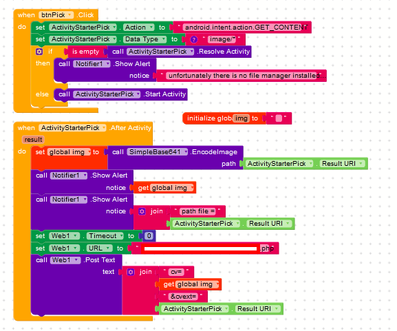 I tried to pick up file from the gallery and upload it after encoding it to base64 and post to my php script in order to make a file out of it , but sadly it keep showing runtime error can you please help me where is the problem ?