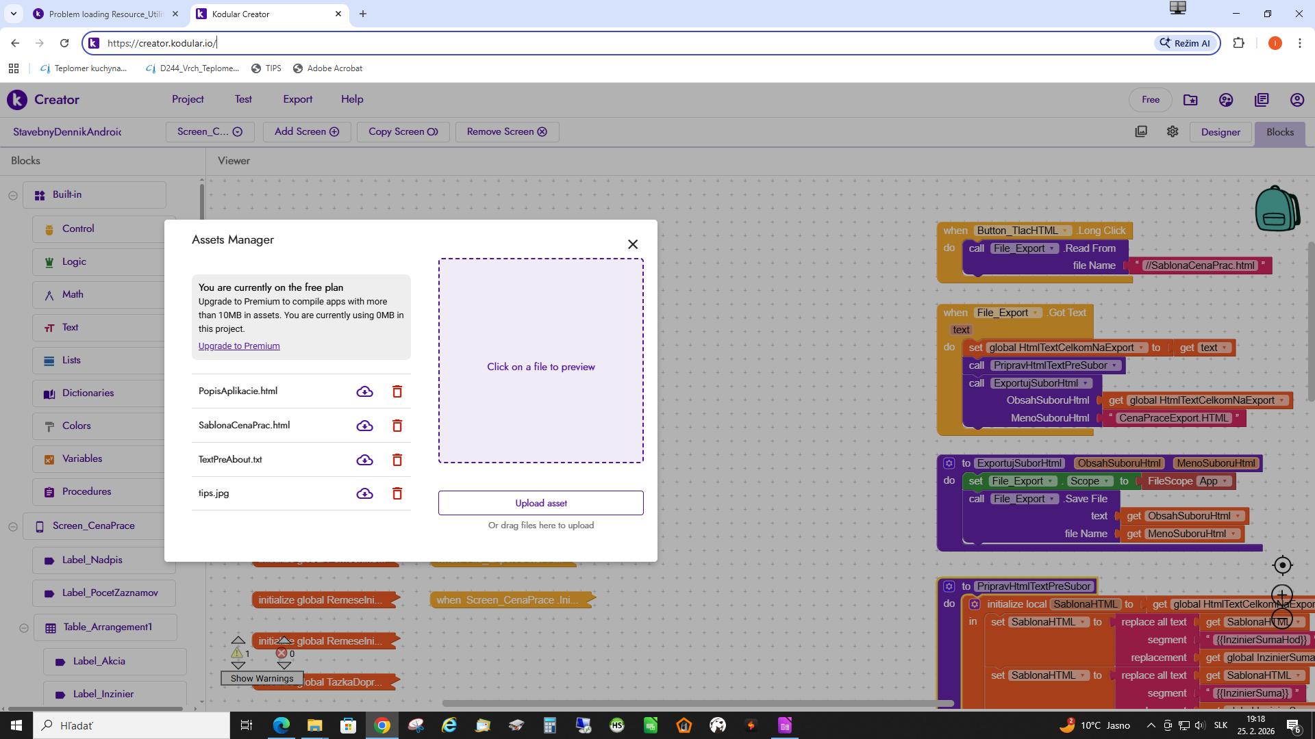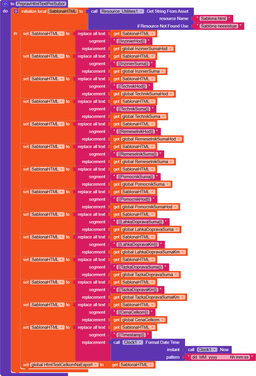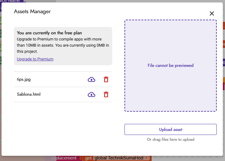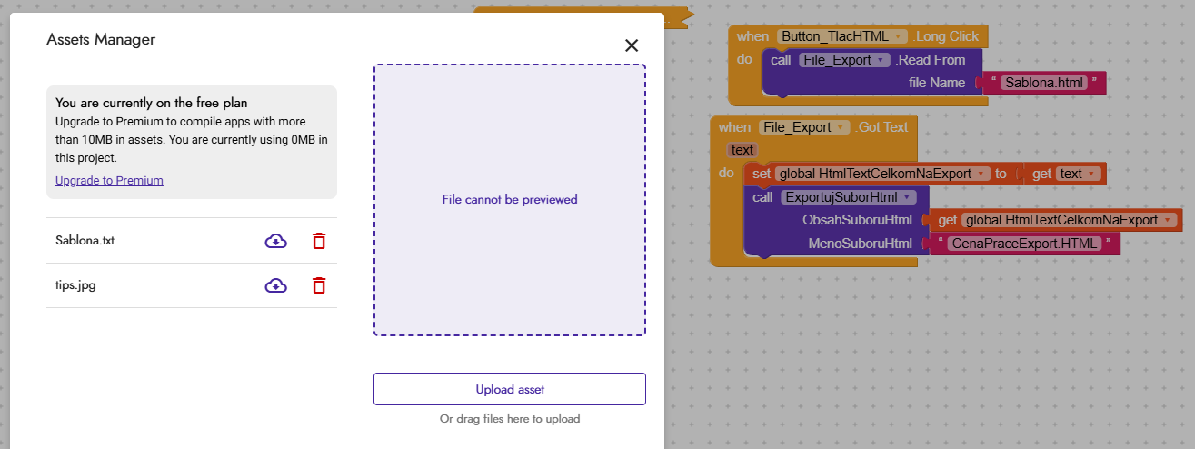 Even though the file Sablona.html exists in ASSET, the GetStringFromAsset block does not load the file and loads the string “Šablóna neexistuje” into the SablonaHTML variable. I can’t figure out where the problem is.